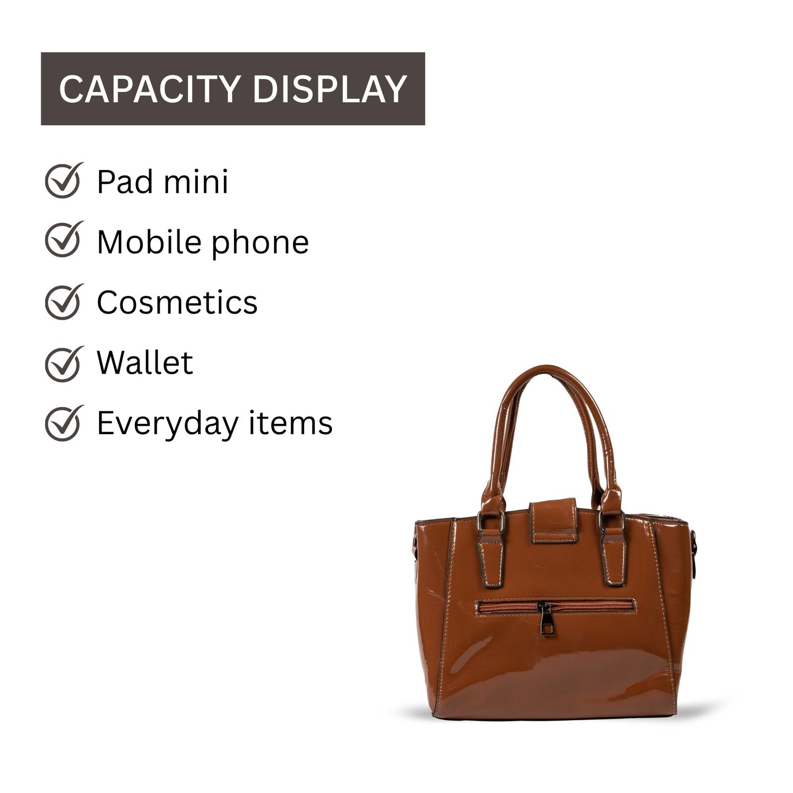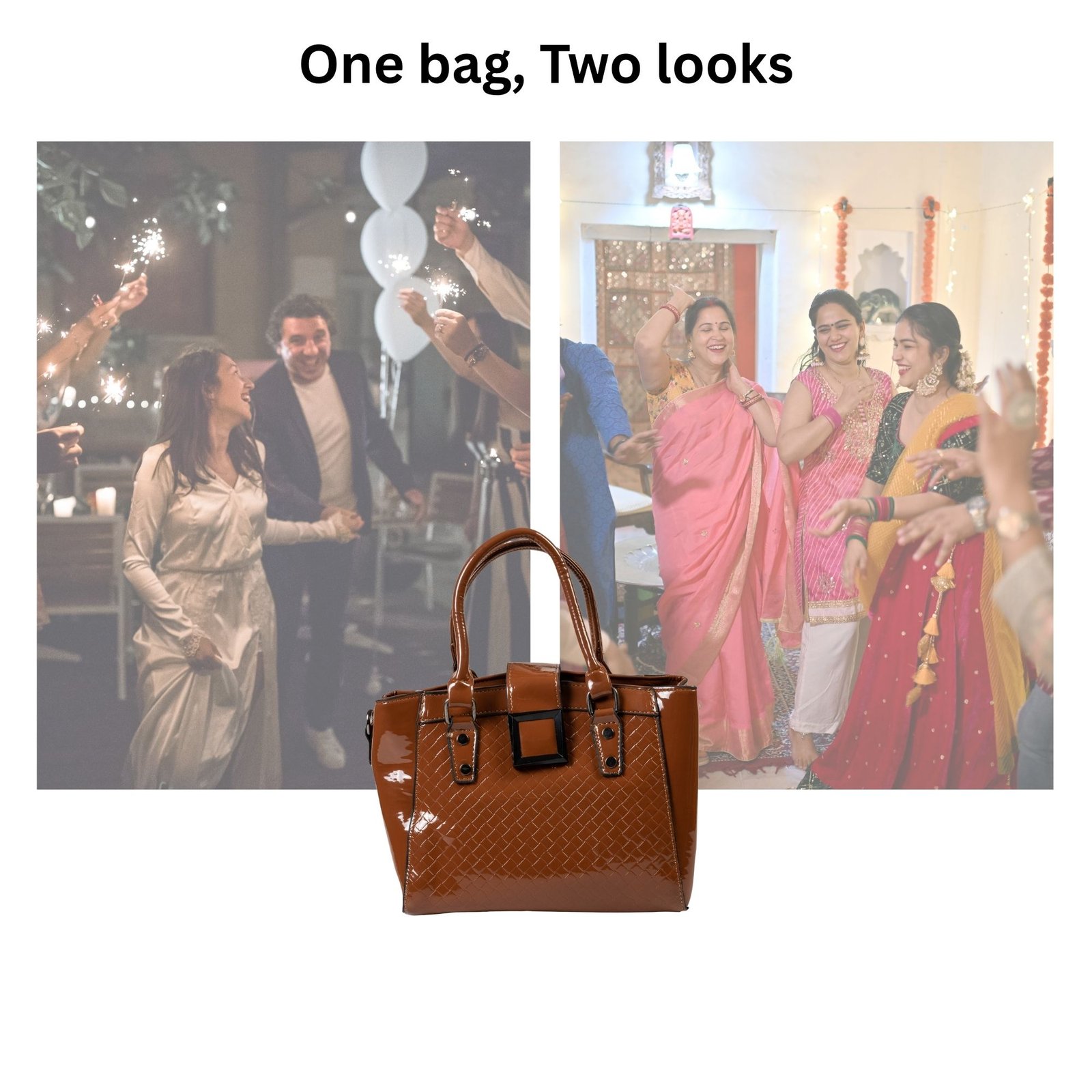 The warm Oakwood Brown shade adds a rich, earthy charm, while the durable dual handles ensure comfortable carrying throughout your day. The spacious interior comes with multiple organizer pockets, allowing you to keep your essentials—phone, wallet, cosmetics, keys—neatly arranged and easily accessible.