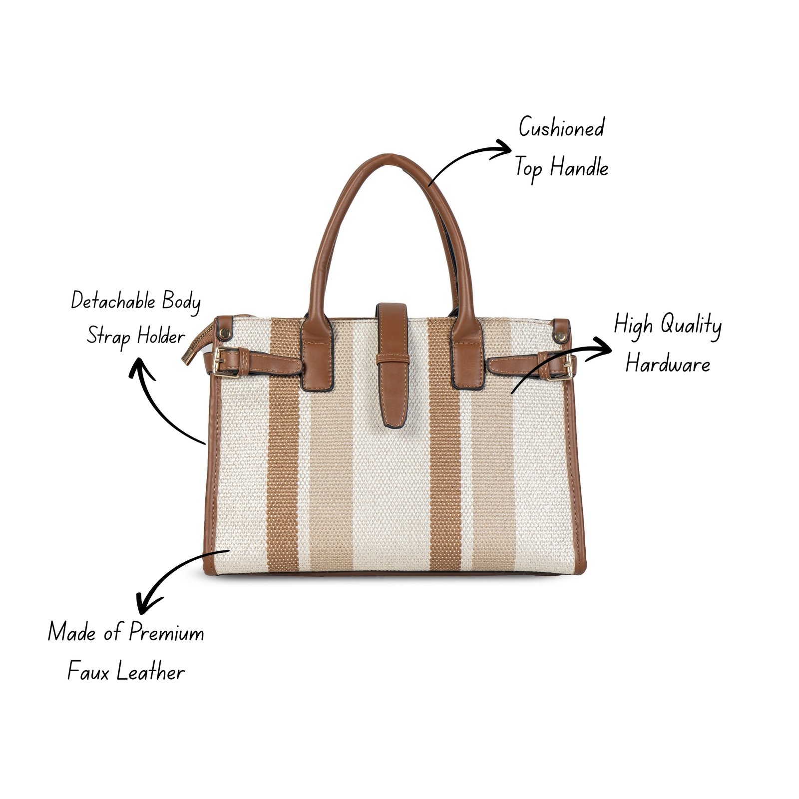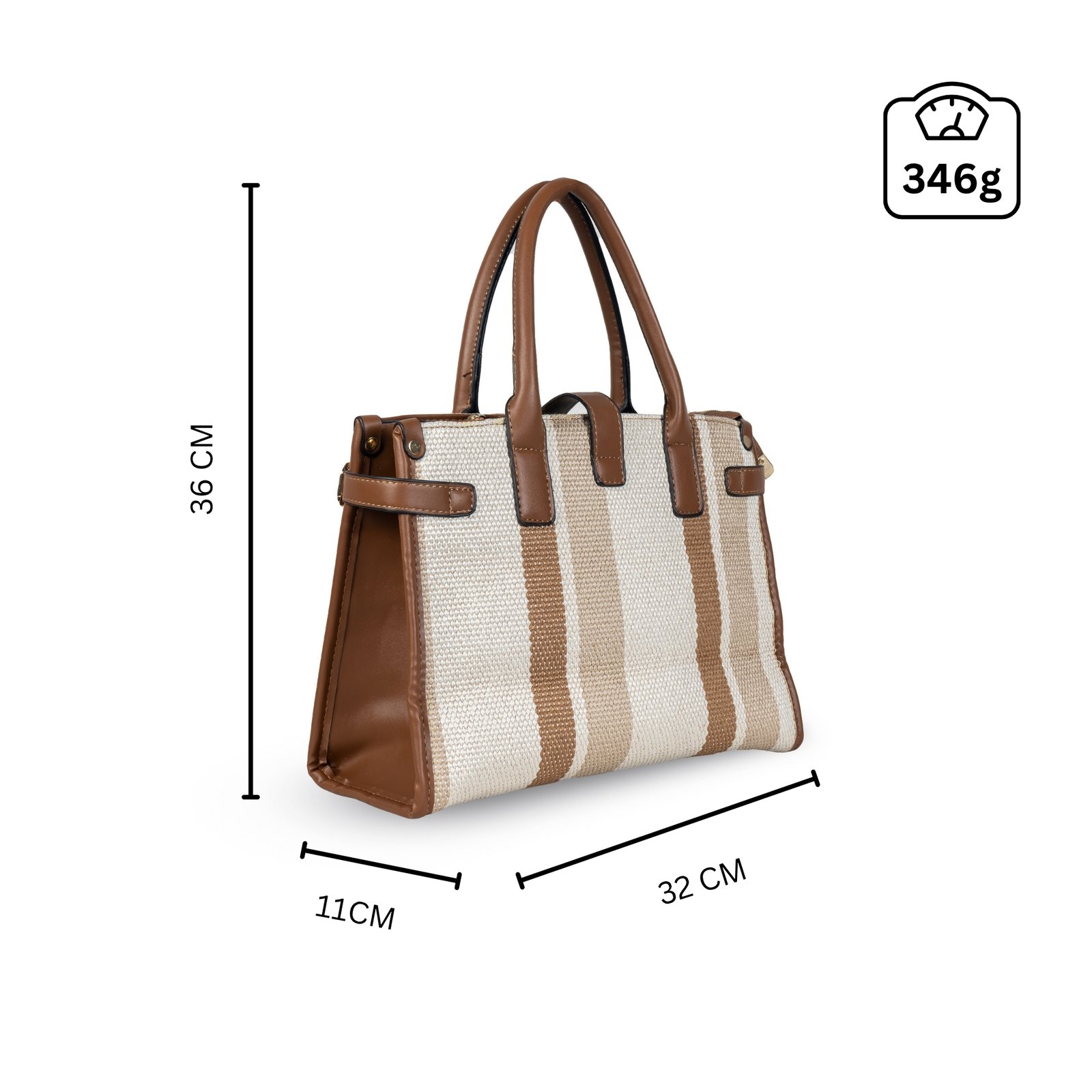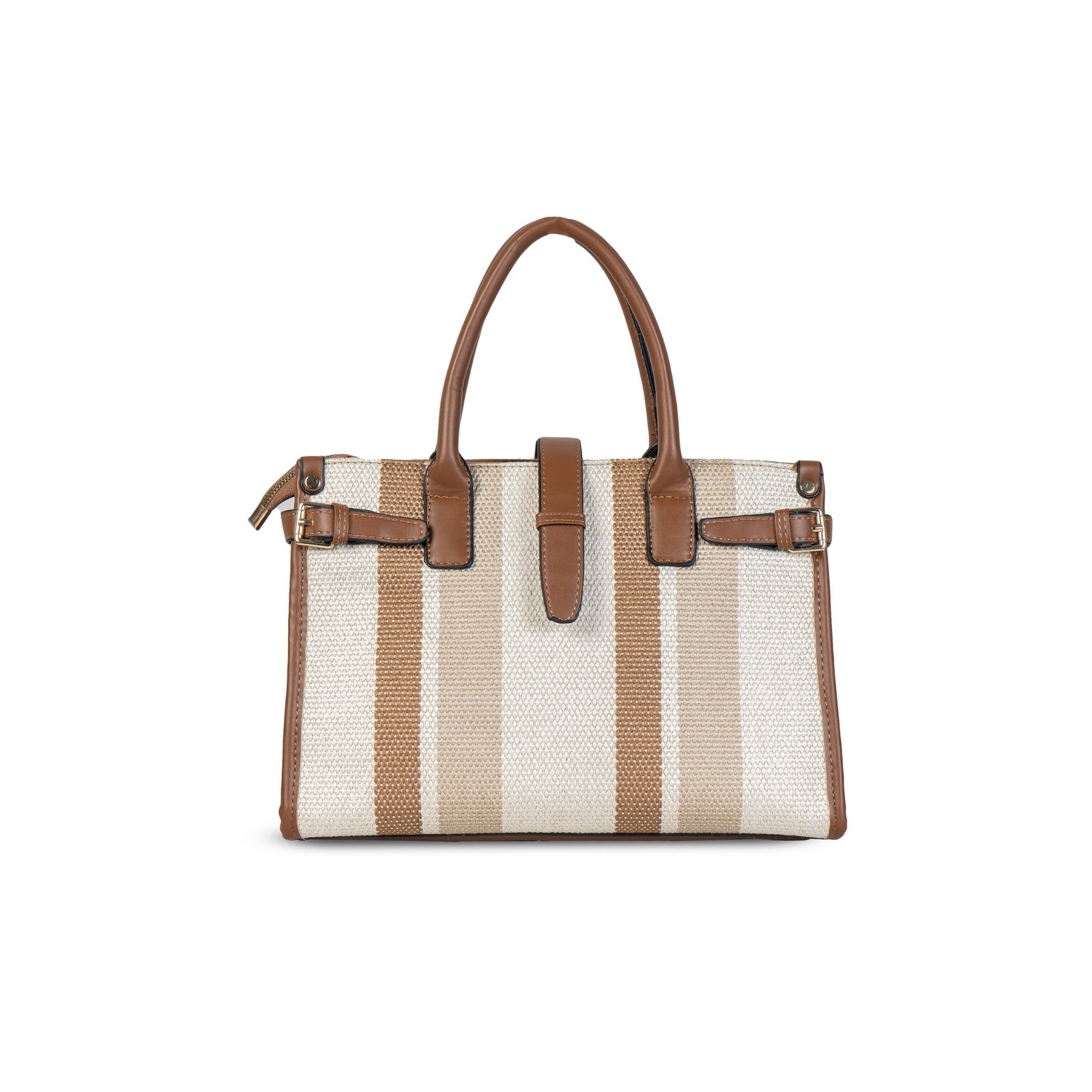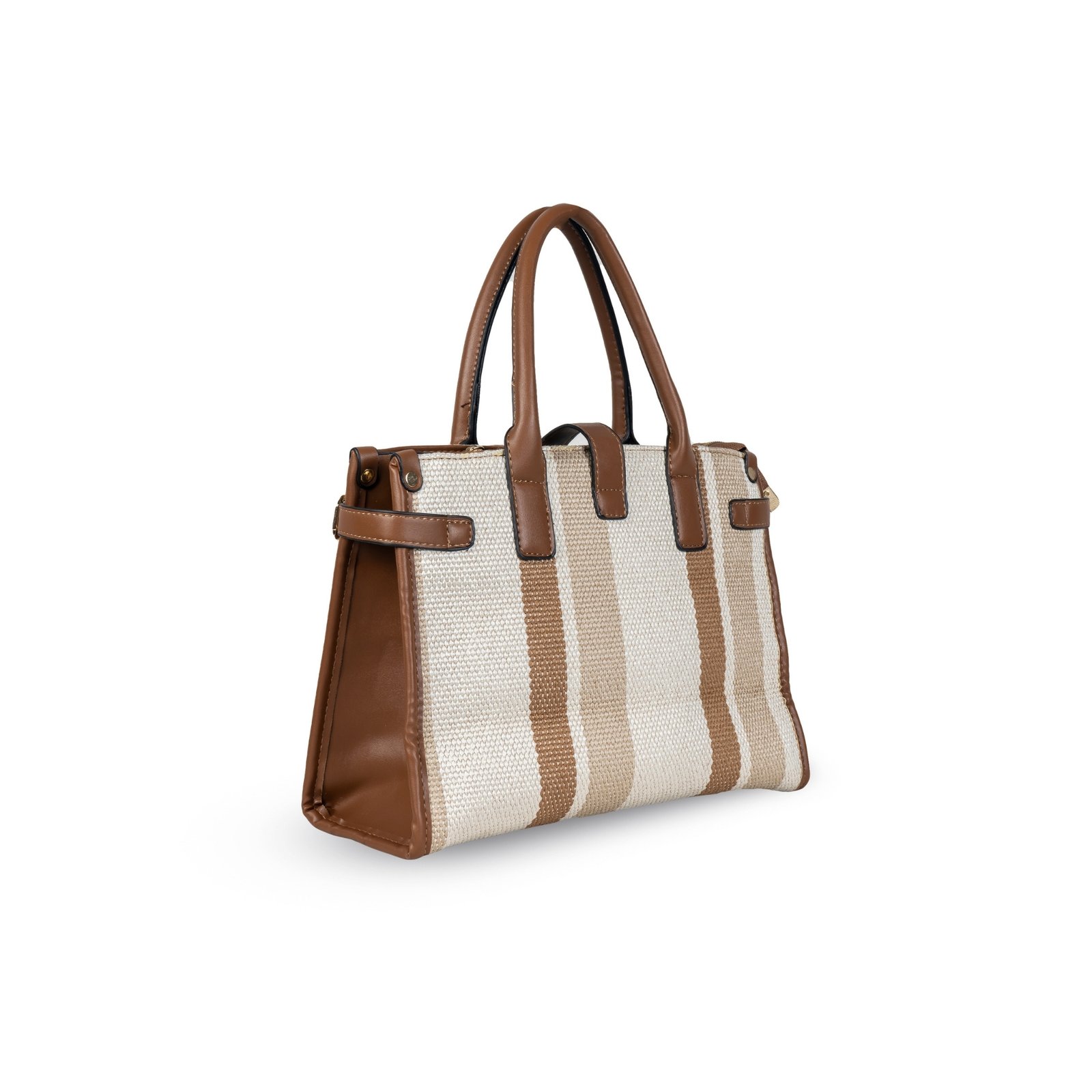 The bag features dual-tone reinforced handles, gold-accent hardware, and a sleek central strap detail that adds modern charm. With a spacious interior and organized compartments, it ensures you carry your essentials in effortless style.