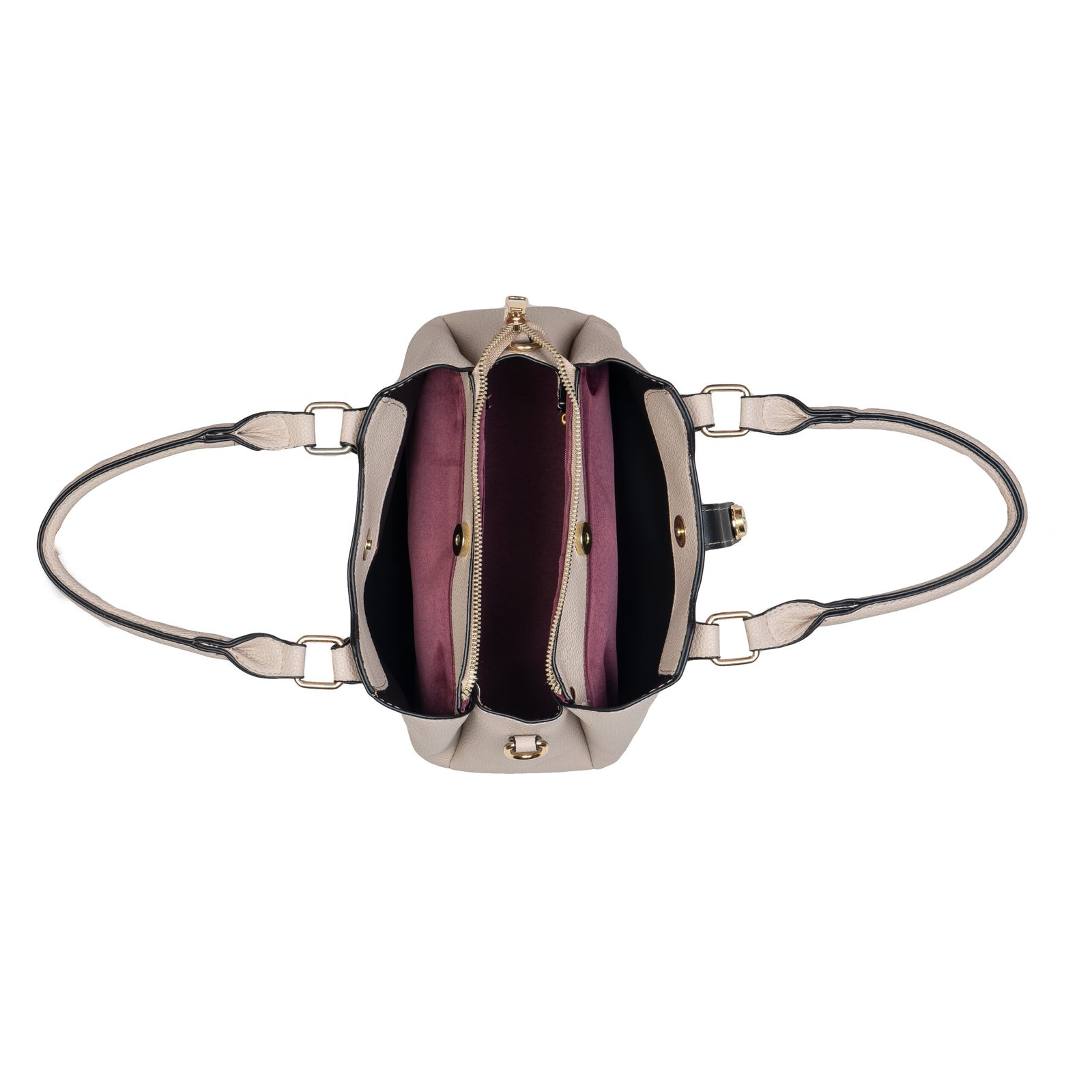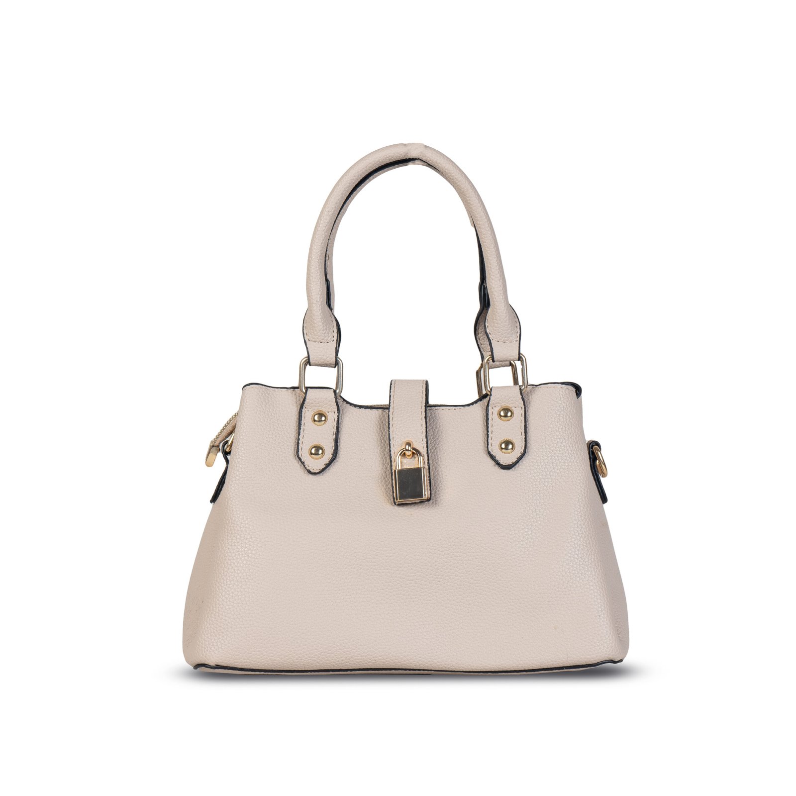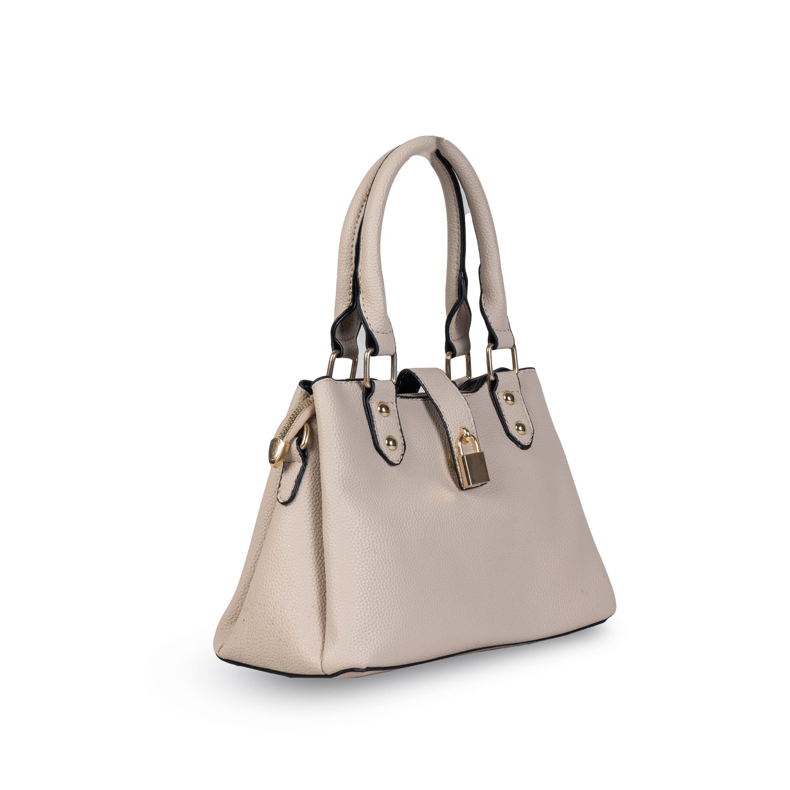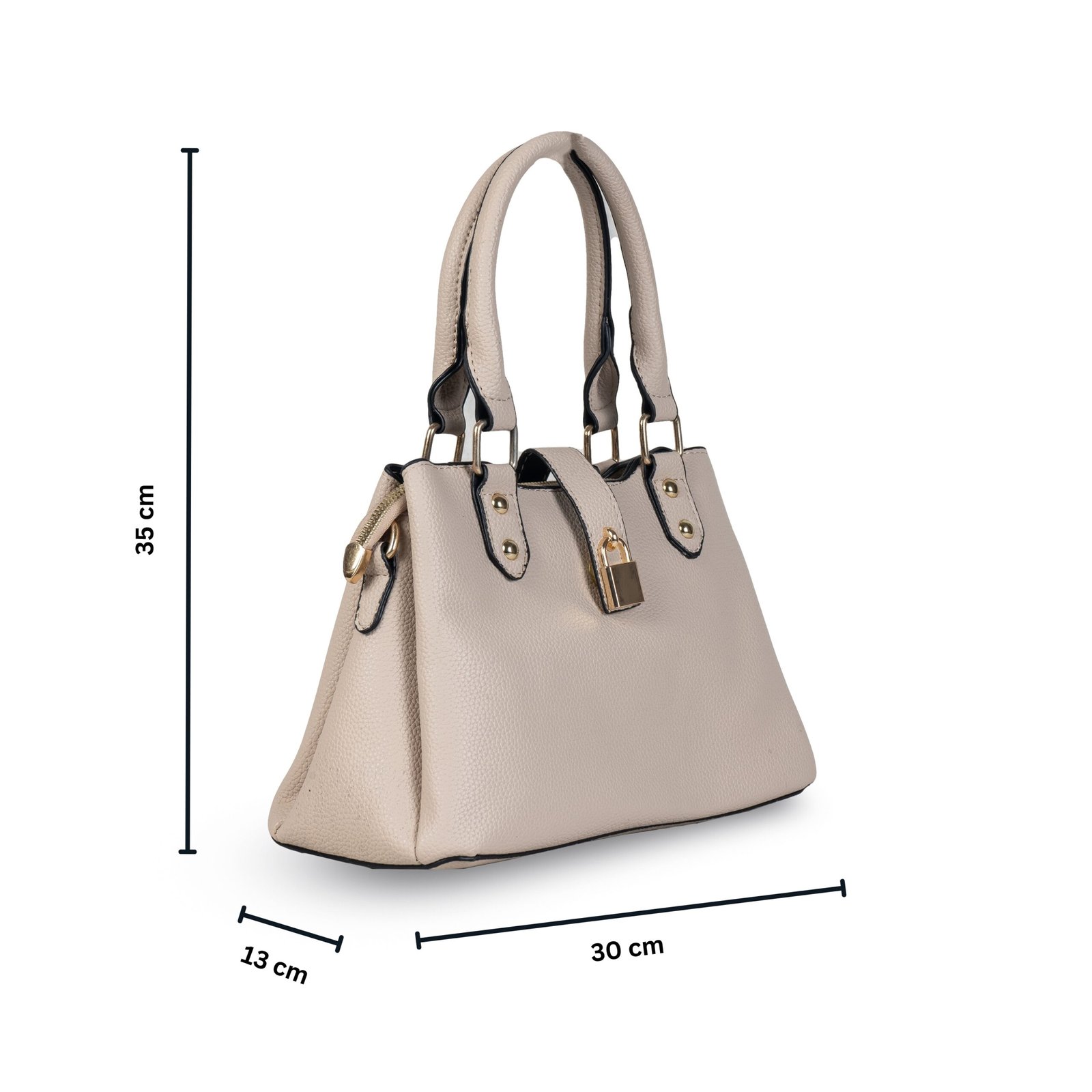 The Soft Almond Beige tone adds a classy, neutral charm, making it perfect for both casual and formal settings. The sturdy dual straps ensure comfortable carrying, while the signature metallic lock detail enhances its sophisticated appeal. Inside, the spacious main compartment is thoughtfully designed with multiple organizer pockets to keep your essentials neatly arranged—phone, wallet, makeup, keys, and more.