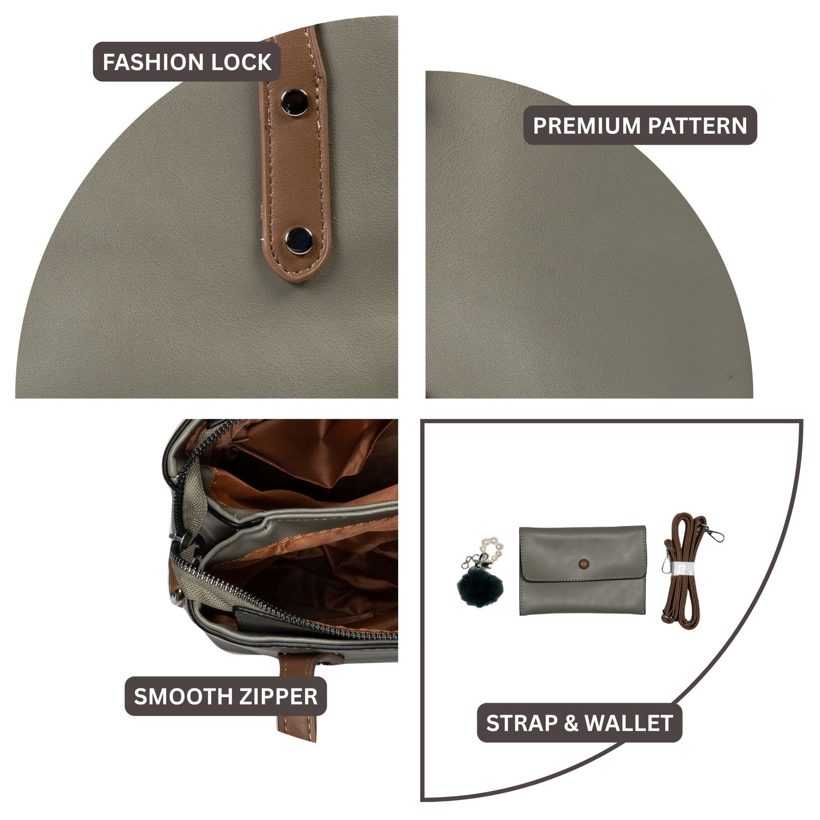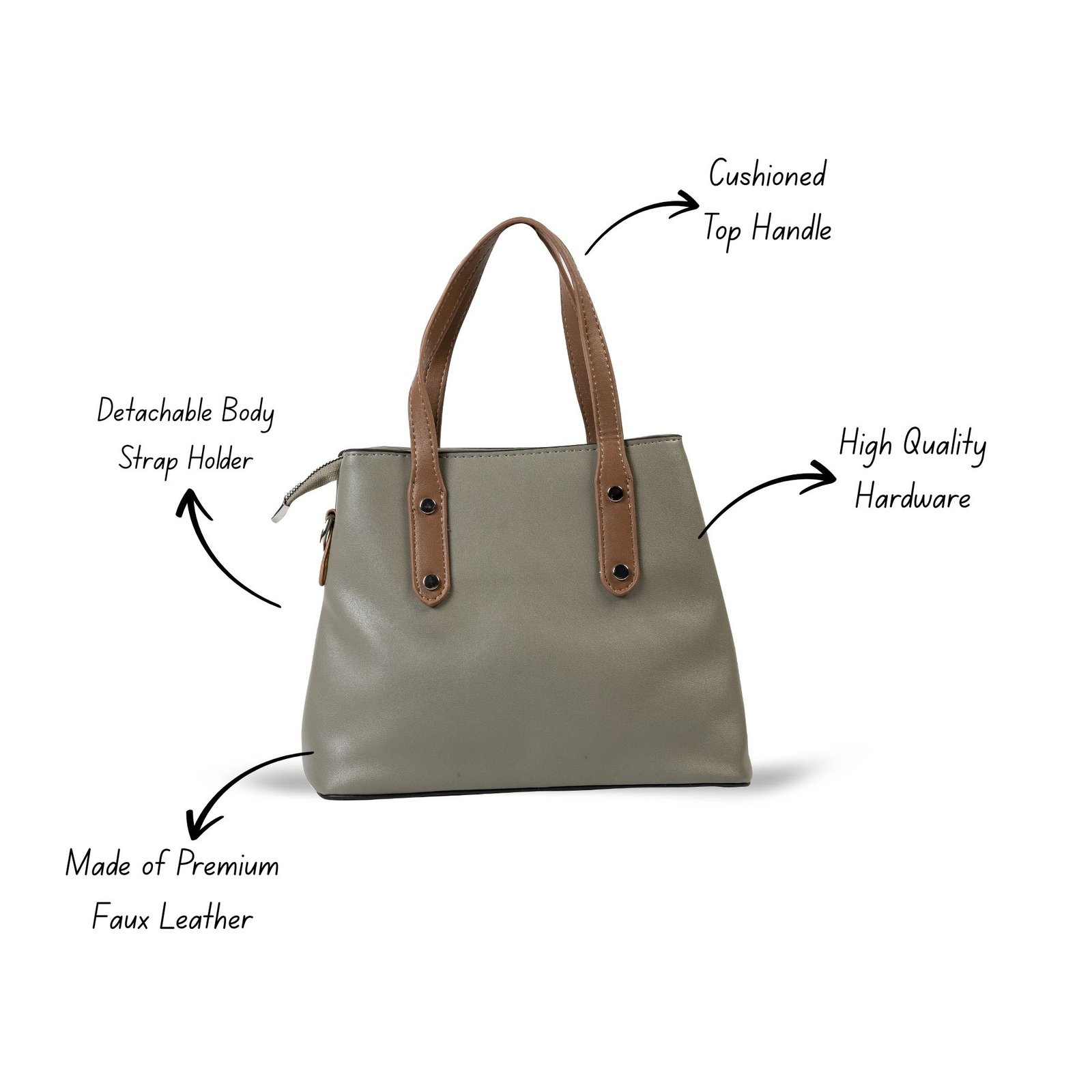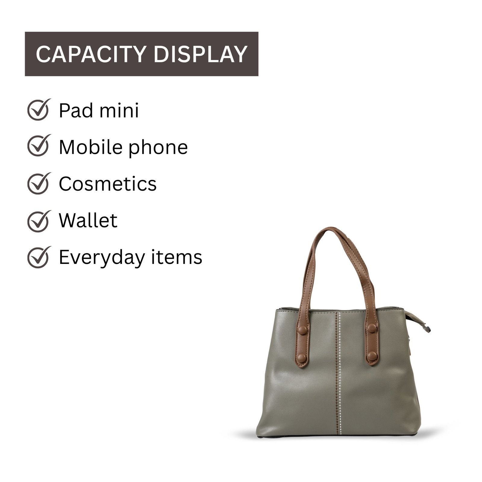 The sophisticated Misty Grey tone enhances its premium appeal, while the sturdy dual handles ensure a comfortable carry throughout the day. The spacious interior includes well-designed organizer pockets, allowing you to keep your phone, wallet, makeup, and other essentials neatly arranged.