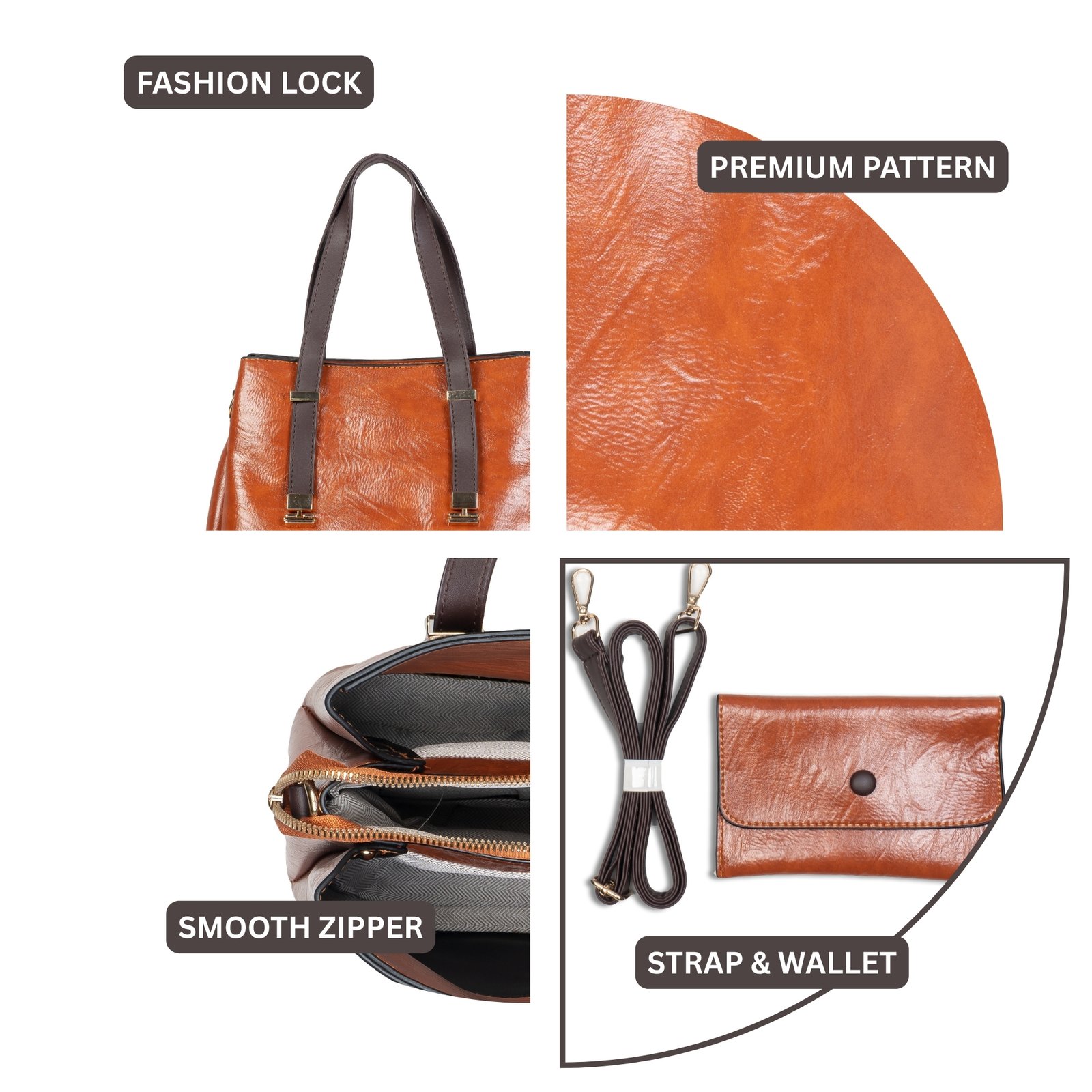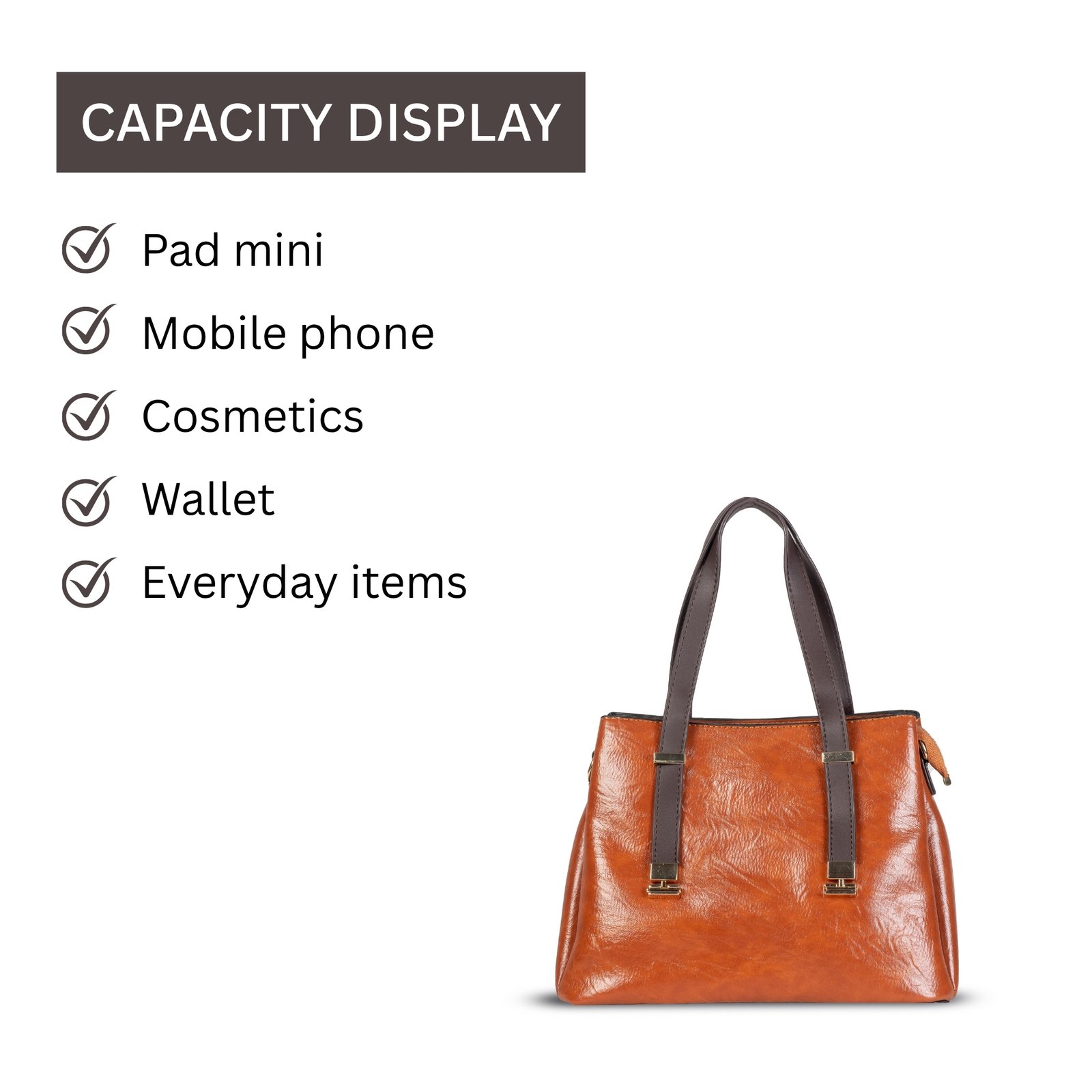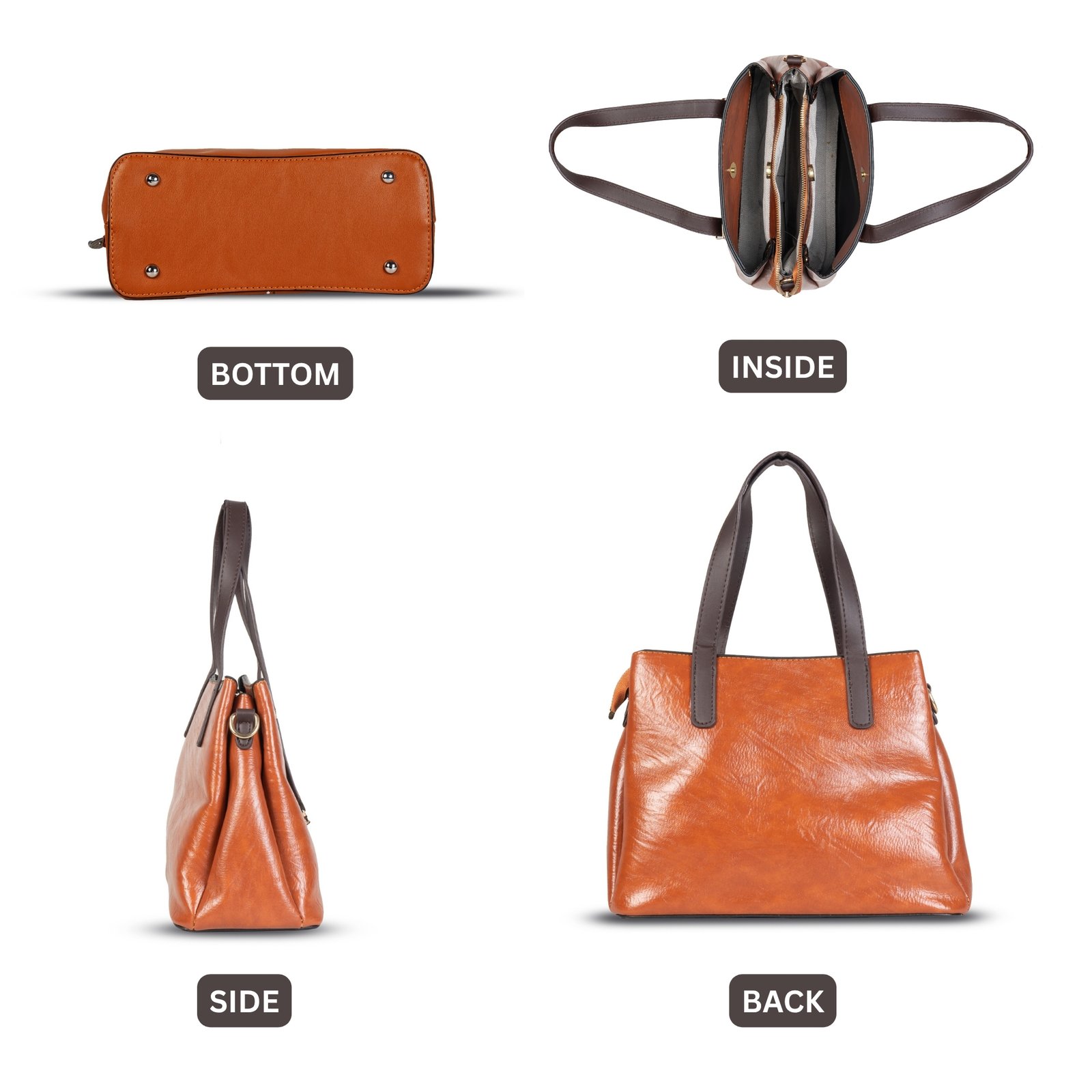 The soft-matte texture gives it a classy, understated luxury feel, while the structured body ensures long-lasting shape and durability. With dual sturdy handles, a spacious compartment, and well-organized inner pockets, this handbag keeps your essentials arranged effortlessly—perfect for office, daily outings, and travel. The warm tan color adds timeless charm, making it a versatile staple in any wardrobe.